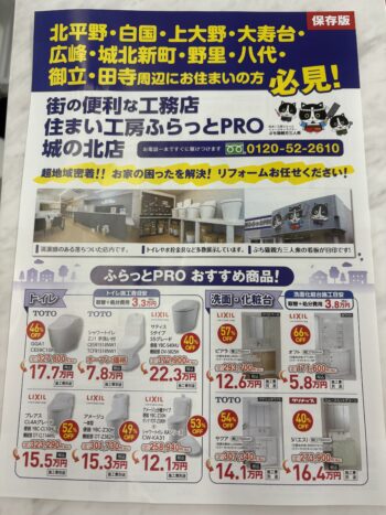 チラシでは、トイレ・洗面化粧台・キッチン。お風呂など