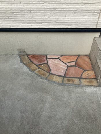 コンクリートとの境目が自然になるように高さを微調整し、さらに暖色系の乱形石を張ることで、シンプルなガレージにアクセントを加えました💖